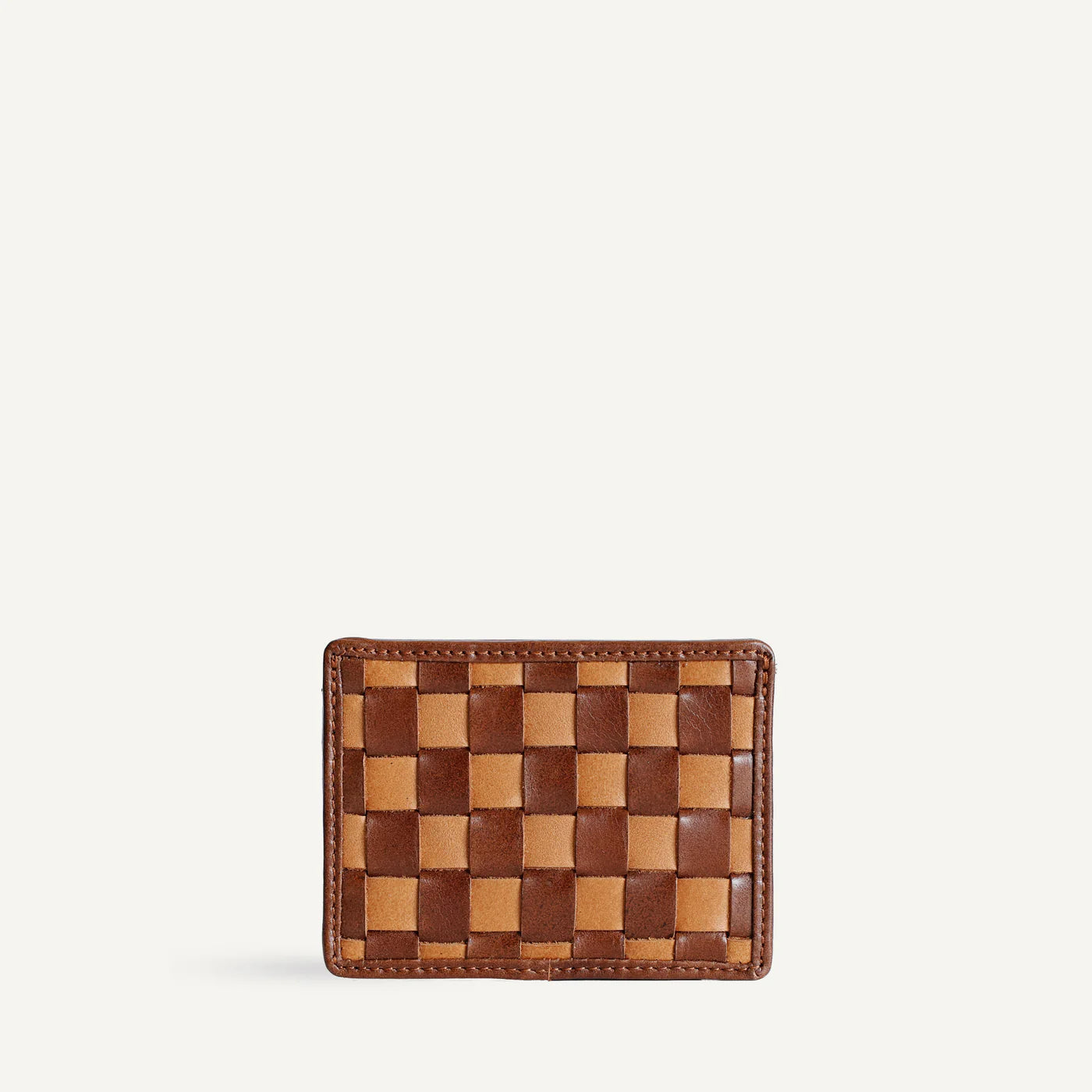A slim, minimalist card case to hold your essentials. In handcrafted woven leather. Features two card slots and a pocket to tuck away loose bills (or love notes).