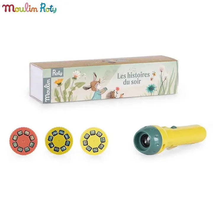 Welcome to the world of the Trois Petits Lapins, three little rabbits at the bottom of the garden! Includes a torch projector and 3 disks for making up wonderful stories at bedtime. Turn off the light to make the magic happen, and off you go...