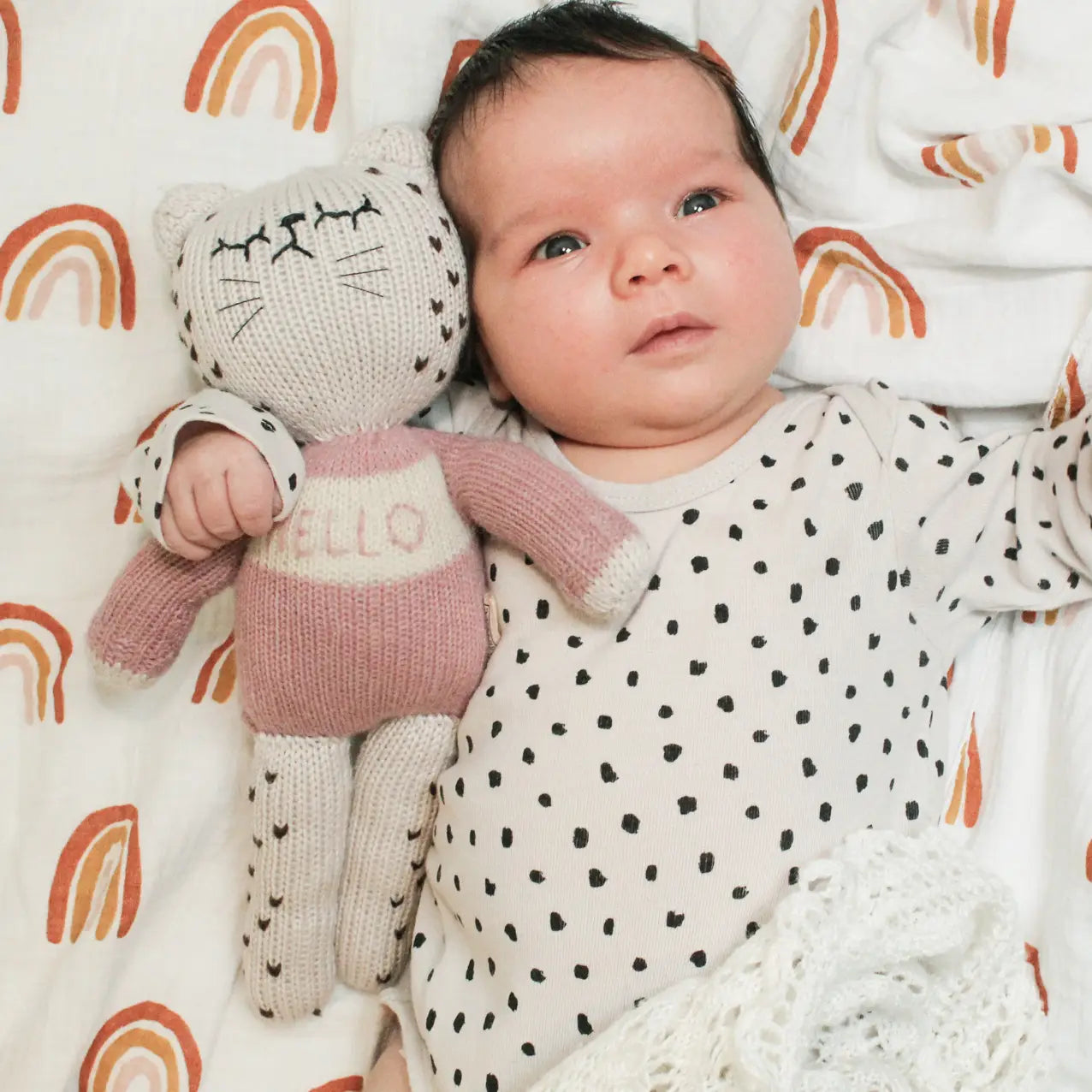 Hello! This handmade cheetah toy is made from lambswool, filled with stuffing made from recycled plastic bottles. The features on this toy have been delicately handsewn, as has the HELLO! across the front. Perfect to welcome a new baby into the world.